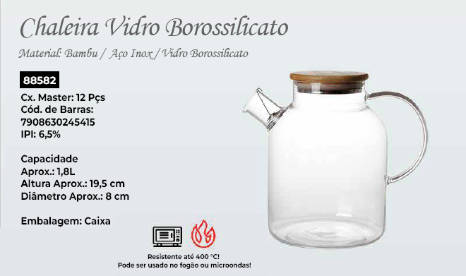 CHALEIRA DE VIDRO BOROSSILICATO C/ TAMPA 1,8L – KEHOME