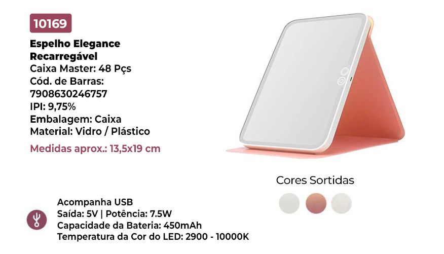 ESPELHO ELEGANCE RECARREGAVEL DE LED 13,5 X 19CM – KEHOME
