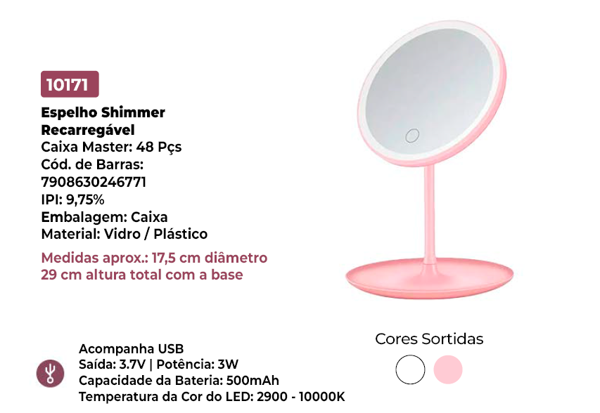 ESPELHO SHIMMER RECARREGAVEL DE LED 17,5CM – KEHOME